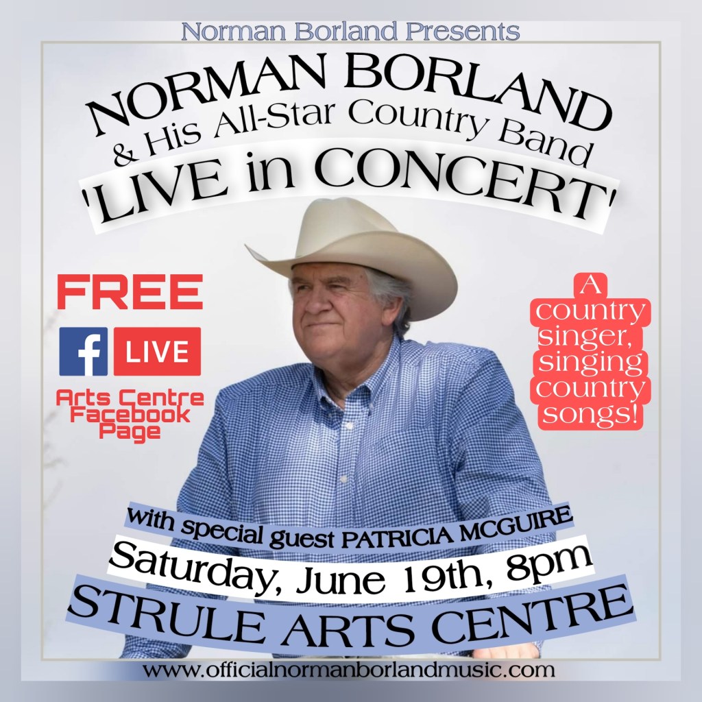 NORMAN BORLAND will perform a Facebook ‘Live’ concert direct from STRULE ARTS CENTRE in Omagh on Saturday, June 19th. The Donegal country singer will take to the stage with an All-Star Country band and his special guest on the evening, PATRICIA McGUIRE, for the hour-long special event which will get underway at 8pm. Fans can enjoy the concert from the comfort of their own homes simply by joining in via the Strule Arts Centre Facebook page.