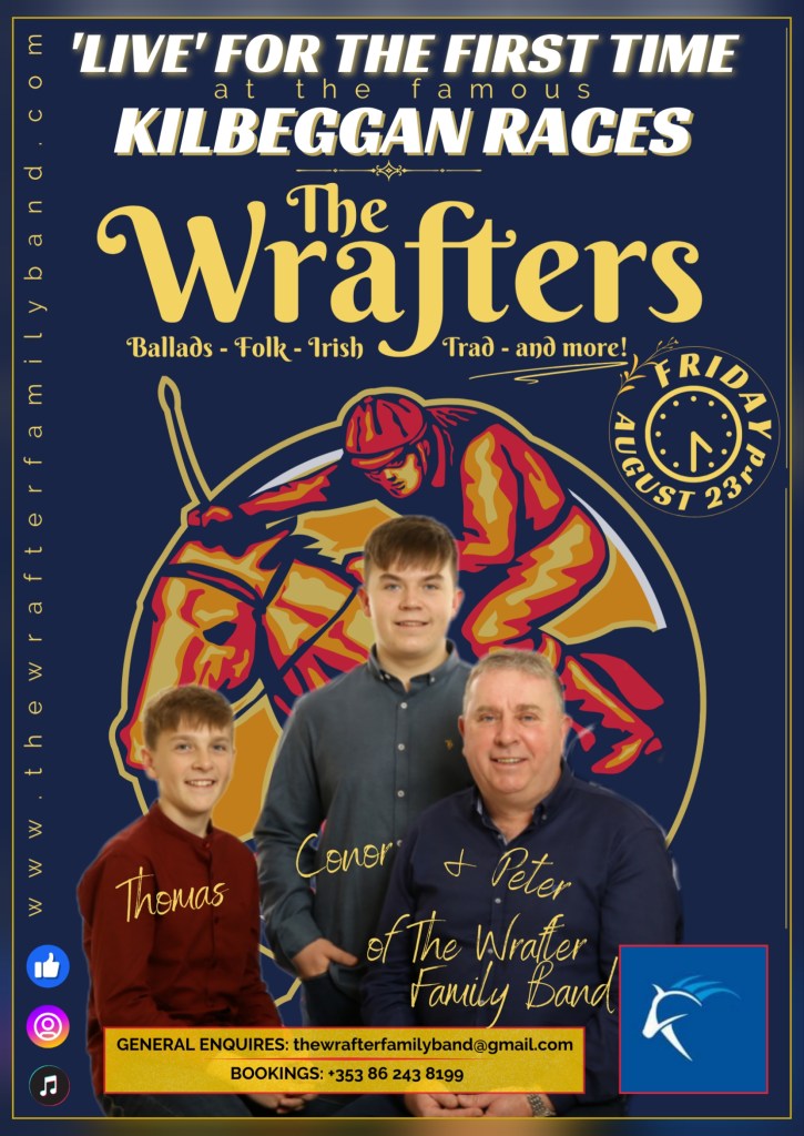~ THE WRAFTERS will perform at the KILBEGGAN RACES on FRIDAY, AUGUST 23rd, from 4.30pm. You can follow THE WRAFTER FAMILY BAND on Facebook, Instagram, Tik-Tok, and YouTube.